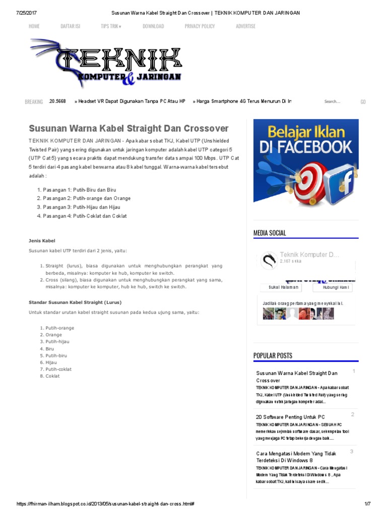 Susunan Warna Kabel Straight Dan Crossover Teknik Komputer