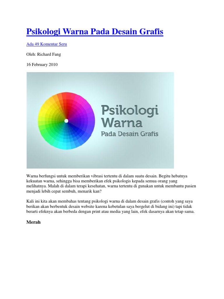 cara memadukan warna dalam desain grafis Warna adalah spektrum tertentu yang terdapat di dalam suatu cahaya sempurna -warna putih- yang merupakan pantulan tertentu dari cahaya yang dipengaruhi oleh pigmen yang terdapat di permukaan benda. Ilmu tentang warna disebut chromatics. Teori warna sudah dikembangkan oleh Alberti 1435 dan diikuti oleh Leonardo da Vinci 1490. Teori warna mulai mendapat perhatian serius setelah dikembangkan oleh Sir Isac Newton 1704.